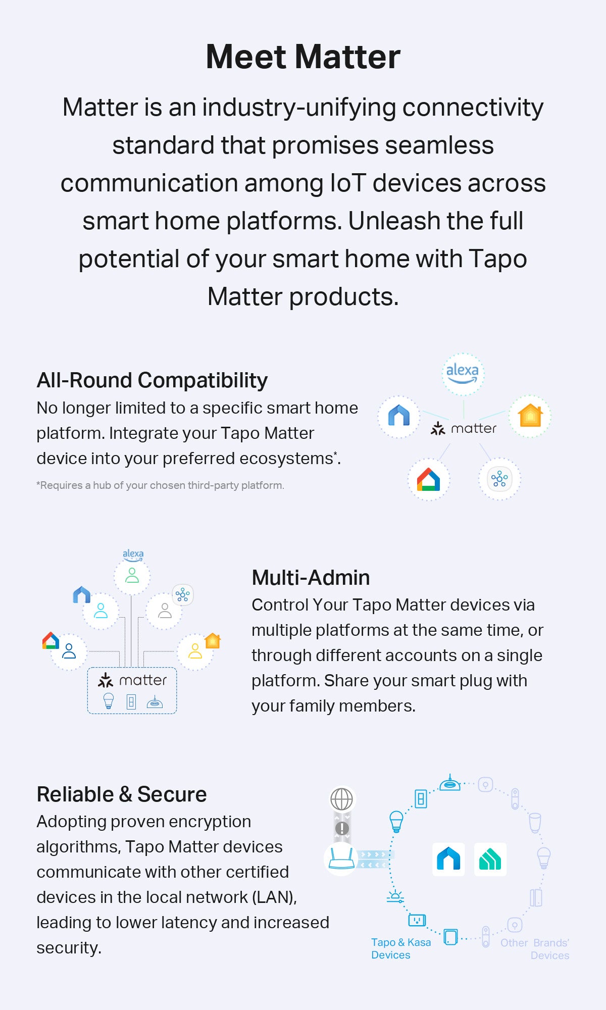 - Integrate Matter-certified Tapo devices with other Matter end products into your preferred ecosystem.